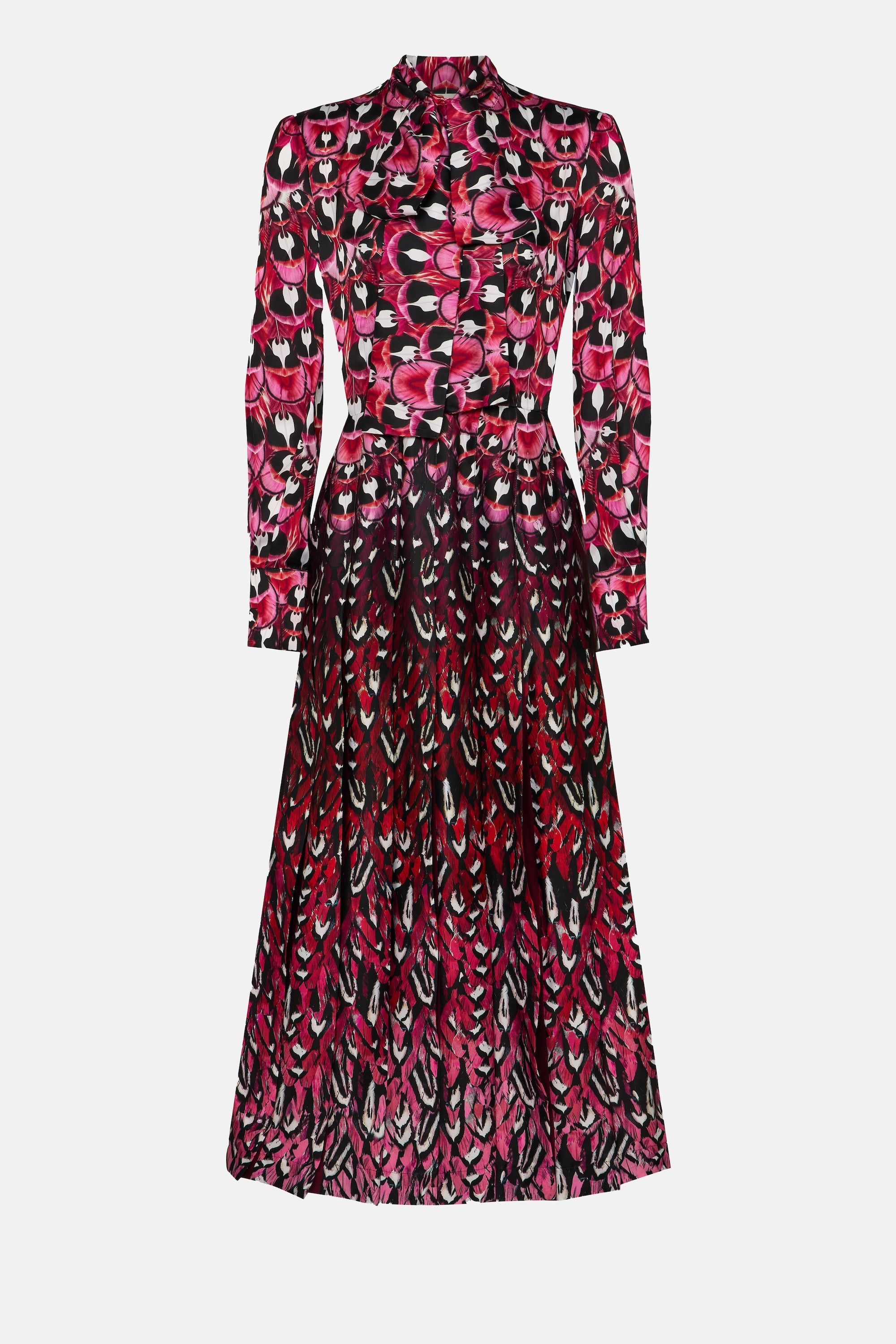 The Alexis Dress in Plumarie Fuchsia Feather showcases cleverly pleated, fully engineered patterns in an ankle-length skirt, fitted through the waist, and finished with long sleeves. This dress creates an elegant yet effortless silhouette that beautifully enhances the feminine form.