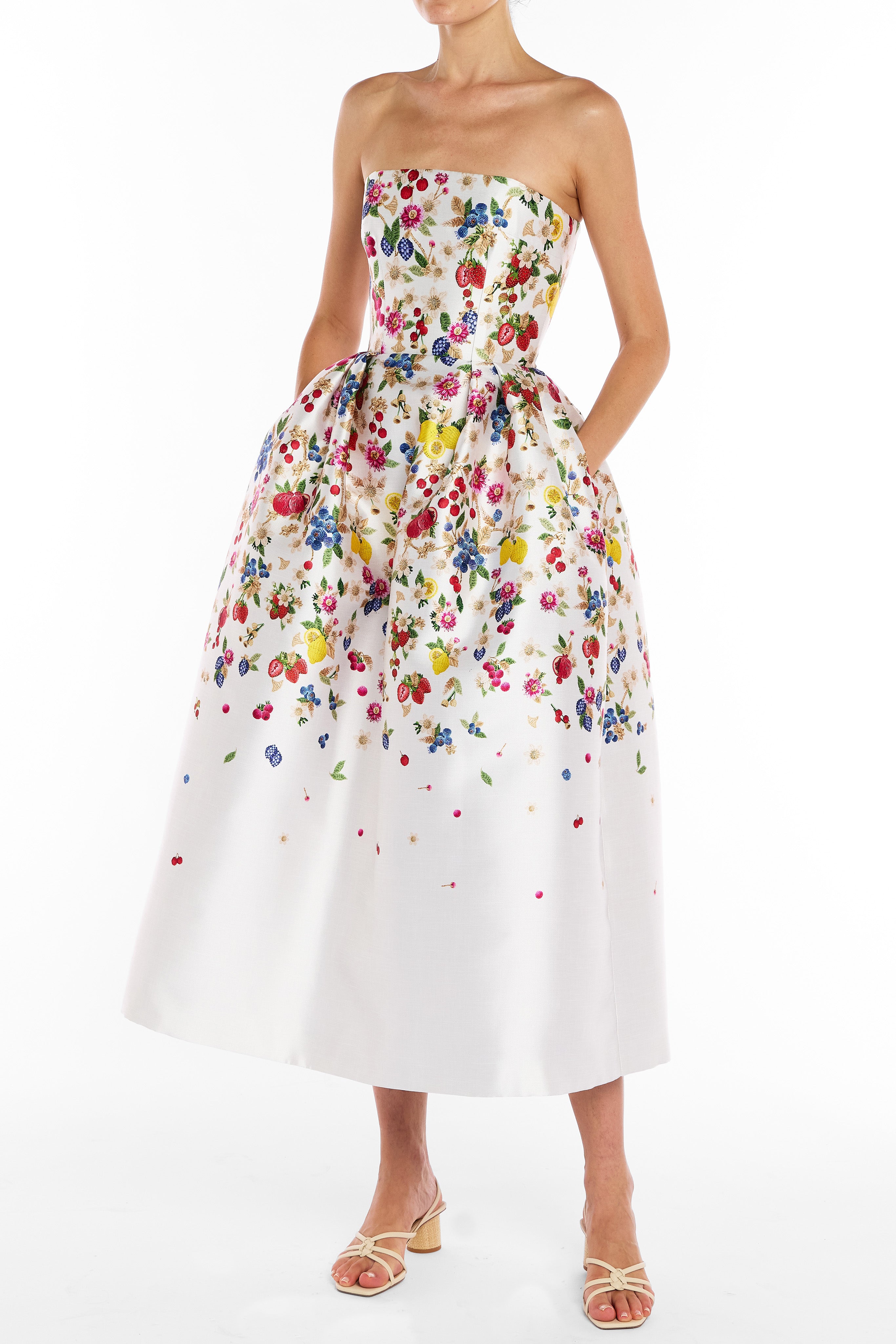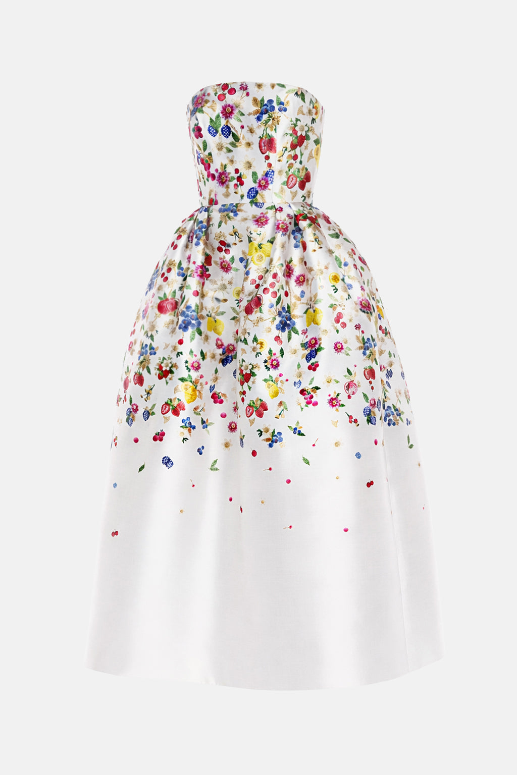The Emile dress in Fruitavola is a striking strapless midi gown designed to captivate with its sculpted silhouette. A structured corseted bodice enhances and defines the figure, while a voluminous skirt with delicate pleats adds movement and drama. Perfect for formal events, weddings, and special occasions, it offers a refined balance of timeless sophistication and feminine grace.
