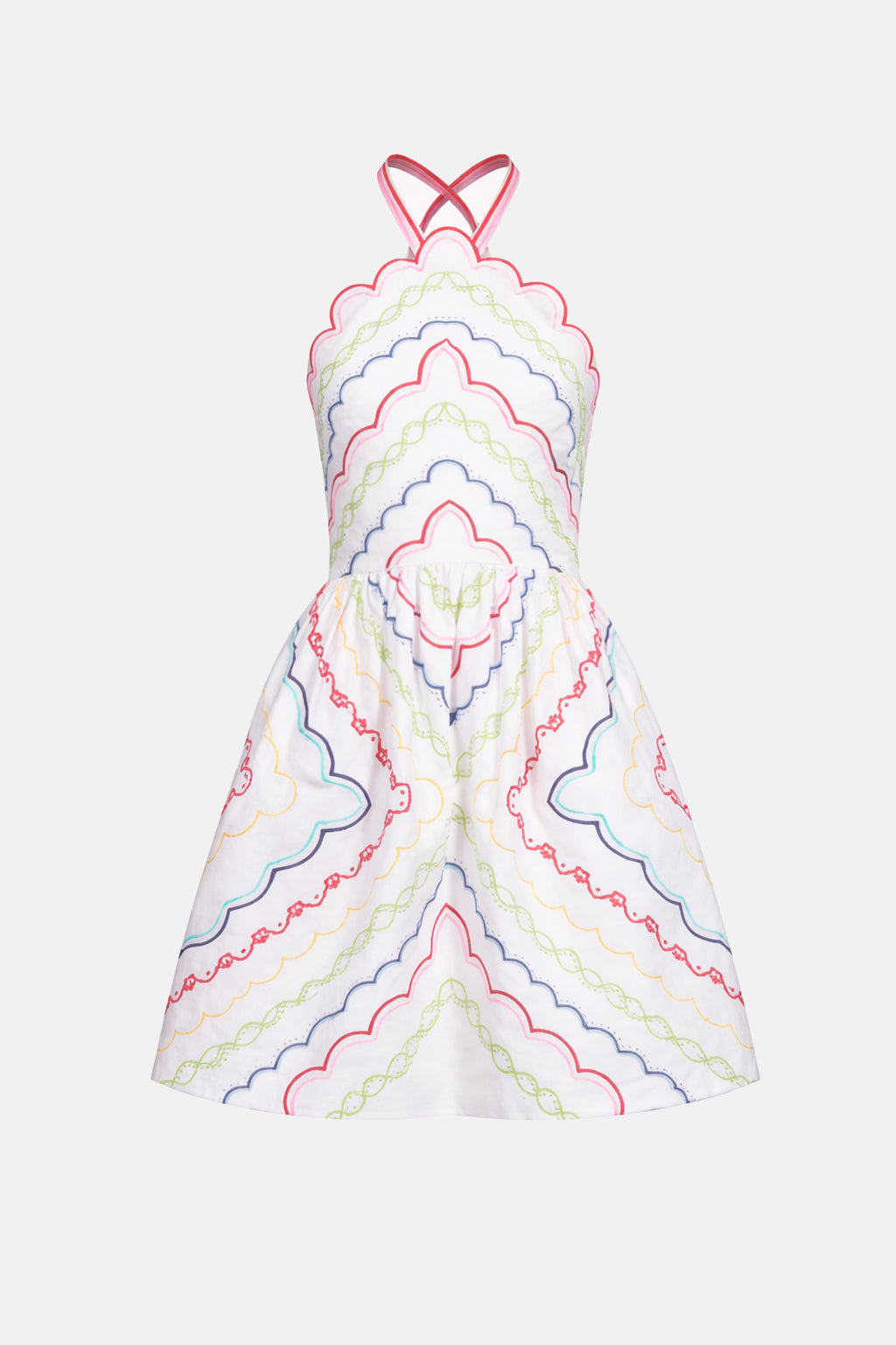 The Petra dress in Blanchetto is a striking mini silhouette designed with an open back and elegant halter neckline. A fitted bodice defines and enhances the figure, while the voluminous skirt creates playful movement and balance. Feminine yet structured, it’s a statement summer piece that blends crisp tailoring with effortless charm.