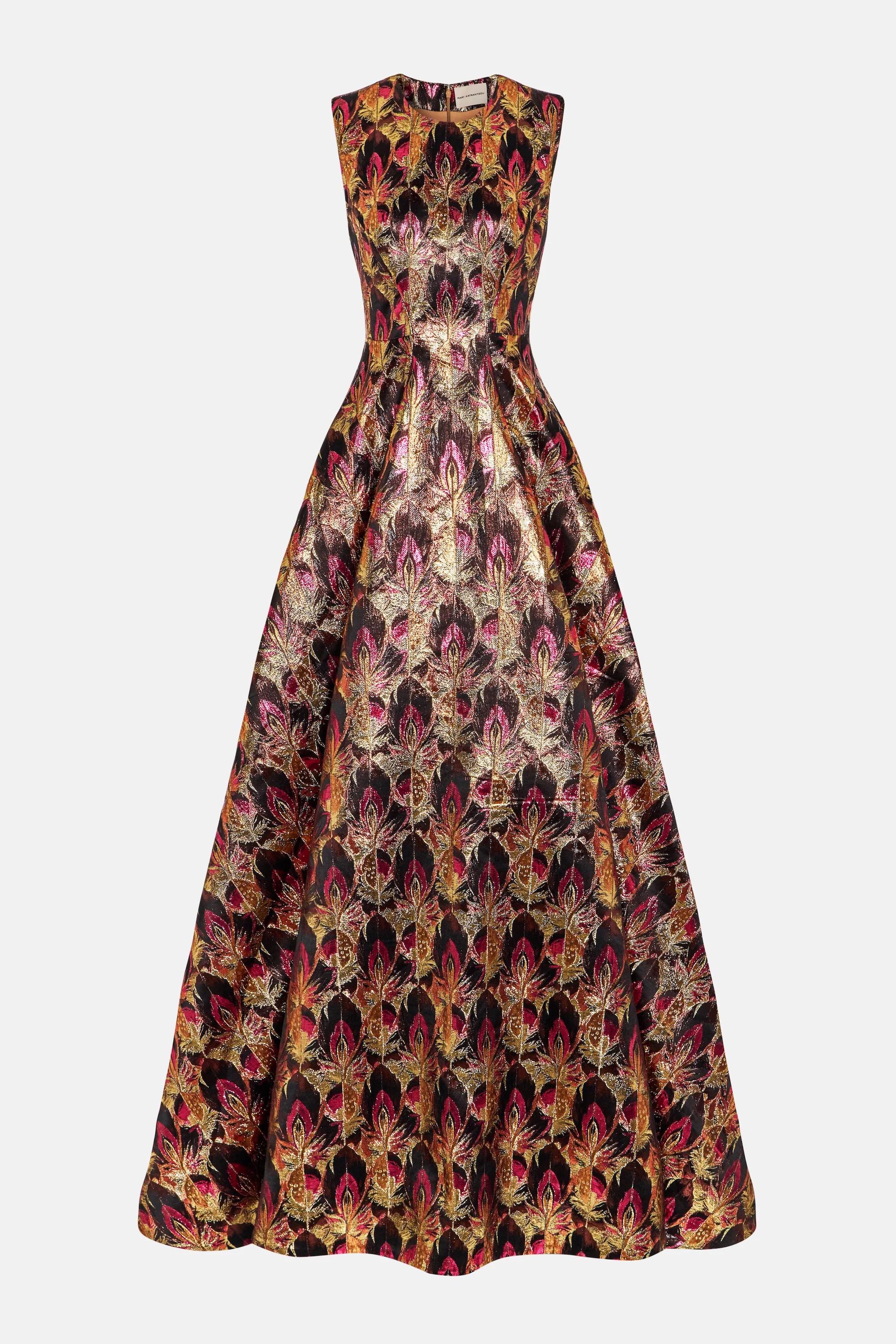 The Vestis Gown in Fuchsia is a stunning floor-length gown that combines luxury with timeless elegance. Crafted from intricate jacquard fabric, this sleeveless dress features a voluminous skirt that flows gracefully, creating a dramatic and flattering silhouette. Perfect for formal events, galas, or evening soirées, the Vestis Dress exudes sophistication and refined glamour with every step.