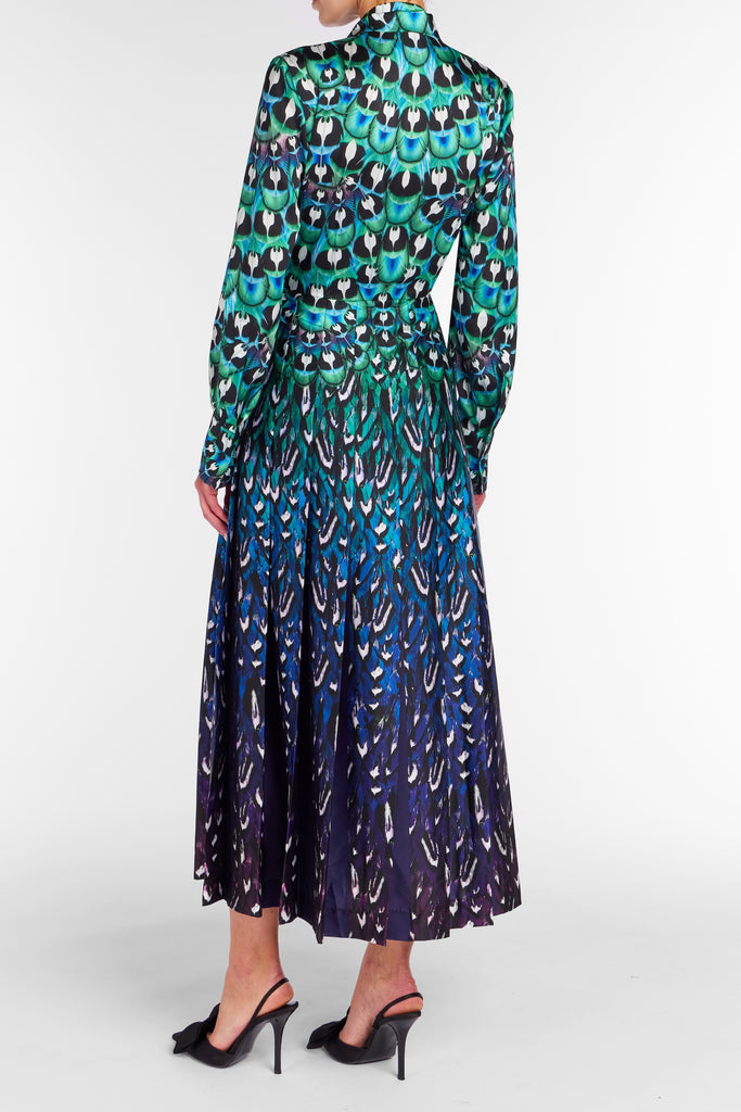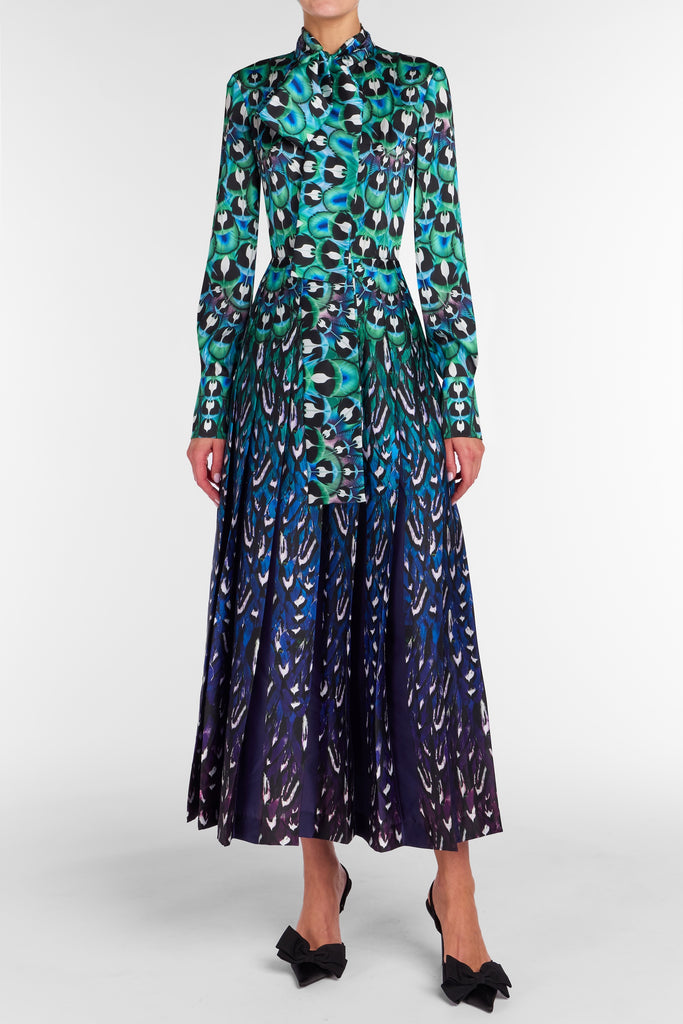 The Alexis Dress in Plumarie Teal Feather showcases cleverly pleated, fully engineered patterns in an ankle-length skirt, fitted through the waist, and finished with long sleeves. This dress creates an elegant yet effortless silhouette that beautifully enhances the feminine form.