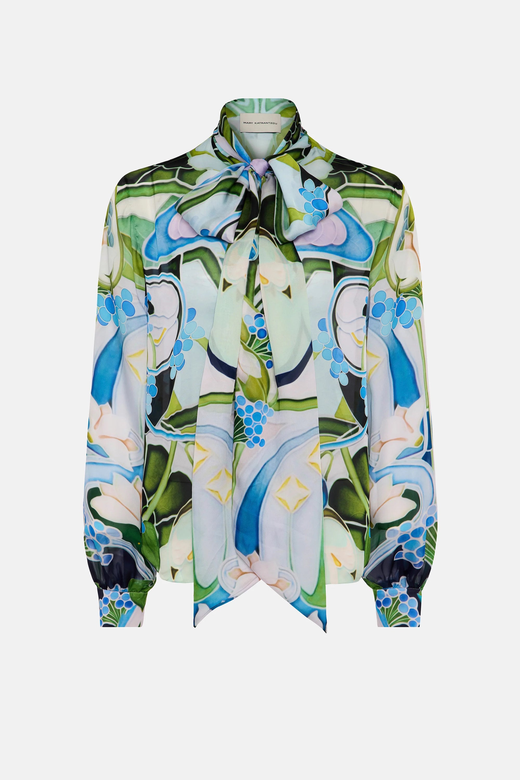 The Ceramica print in lilac and periwinkle hues offers a contemporary take on classical design, with its striking linear structure. Delicate sprigs and blooming, lampshade-like Art Nouveau motifs intertwine with vibrant lily pads, gracefully arching across hems and elongating the figure. Silver-coated fabrics add an iridescent sheen to deep navy tones, beautifully evoking the textured effect of fired glazed hand-painted tiles.