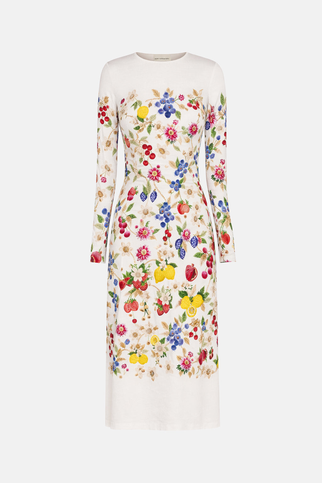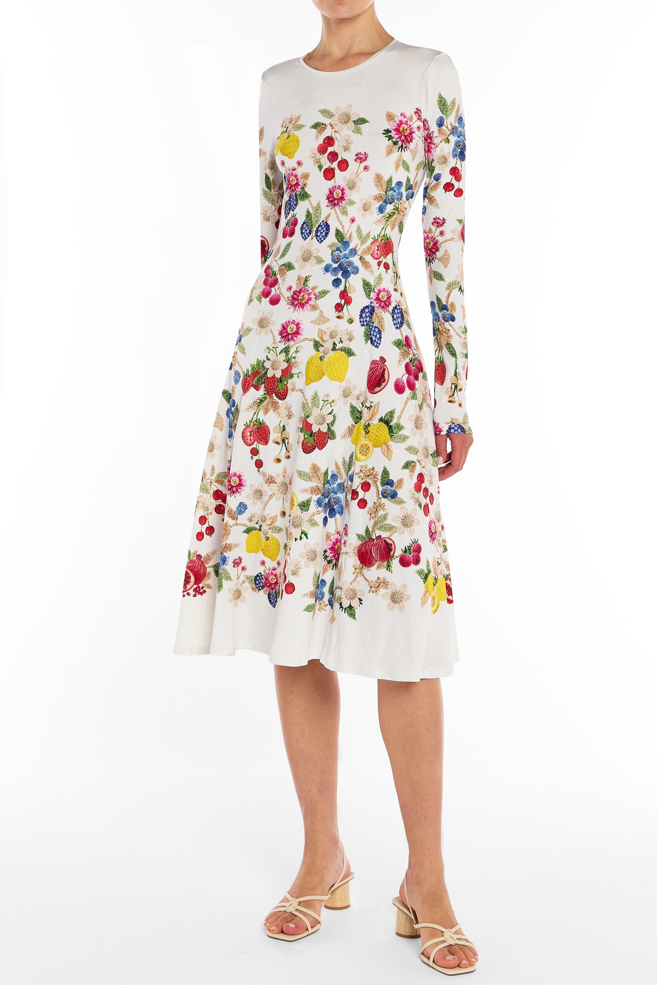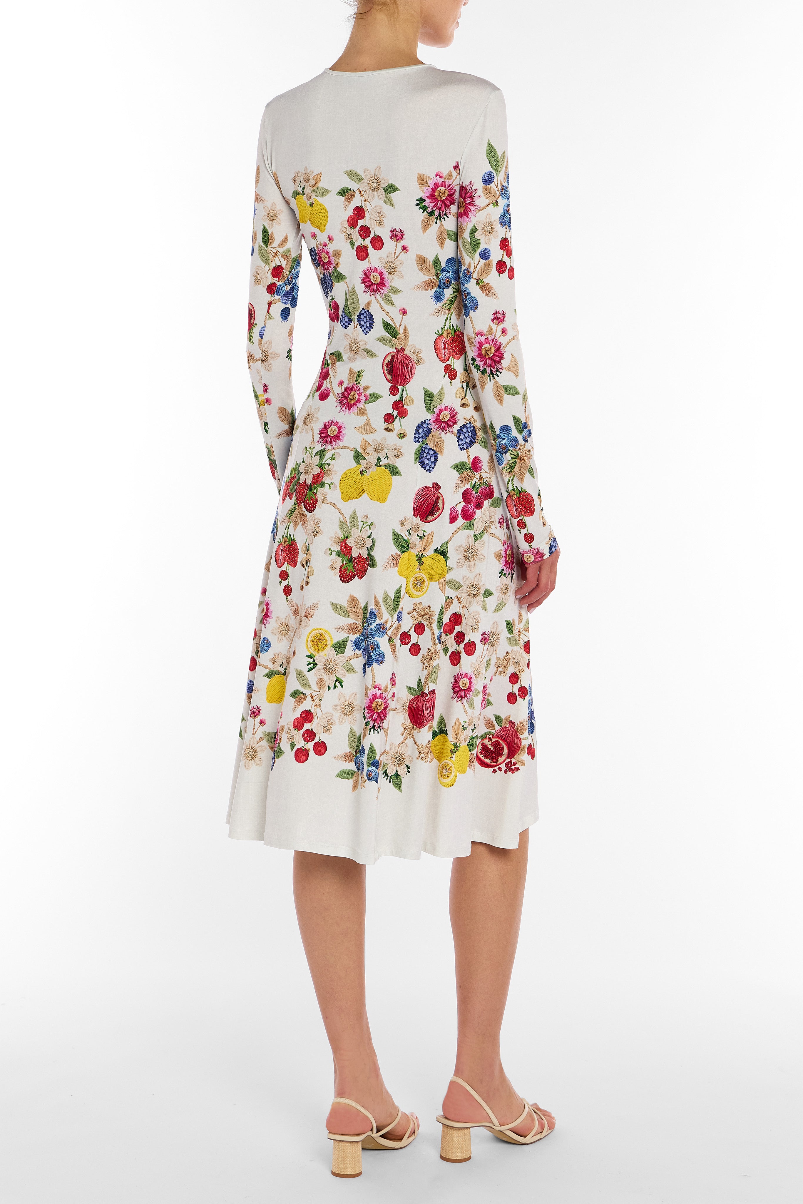 The Laila dress in Fruitavola is a refined jersey midi silhouette designed with long sleeves and a fitted bodice that defines the waist. Falling into a softly flared A-line skirt, it creates a balanced, feminine shape that moves with ease. Comfortable yet polished, it’s an effortless piece that transitions seamlessly from day to evening occasions.