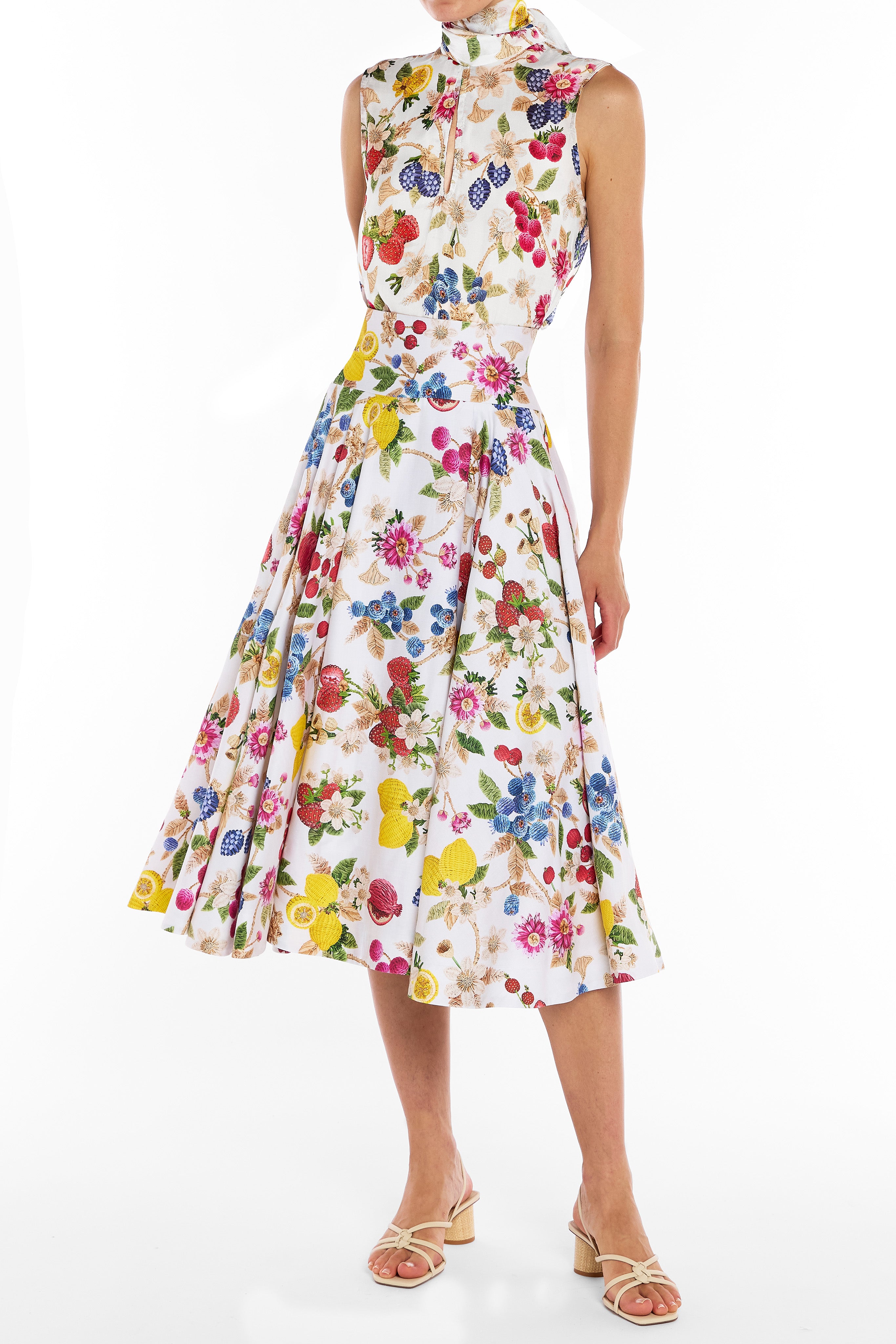 Exploring the idea of tablescapes, the ‘Fruitavola’ story incorporates elements of classic botanical fruits and branches, built in trompe l’oeil raffia effects and set against the texture of a crisp linen backdrop. Rainbow borders are created by layering ombrés of similar hues, banding tiered cotton dresses and flounced sleeves, while select pieces feature cascading placements that disperse across skirts and bodices.