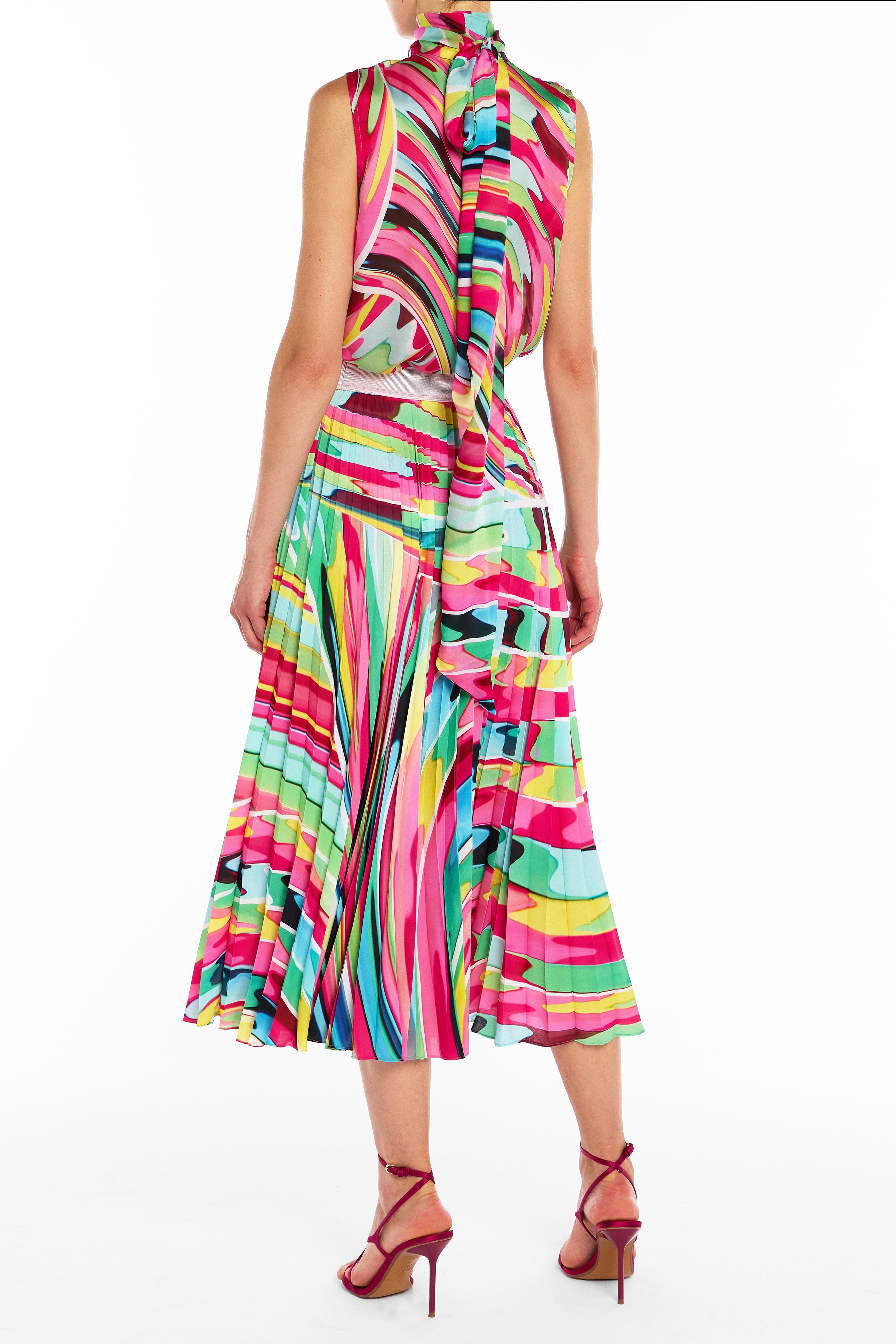 Rainbow stripes fracture across the body, taking inspiration from Venetian glassware made using the ‘Retichello’ technique, forming ribbons of cascading colour. Twisted jersey styles, designed to mimic the curves of the artwork, are complemented by classic silhouettes and delicate beading with fringe, enhancing the movement of these multicoloured glass-like fractals.