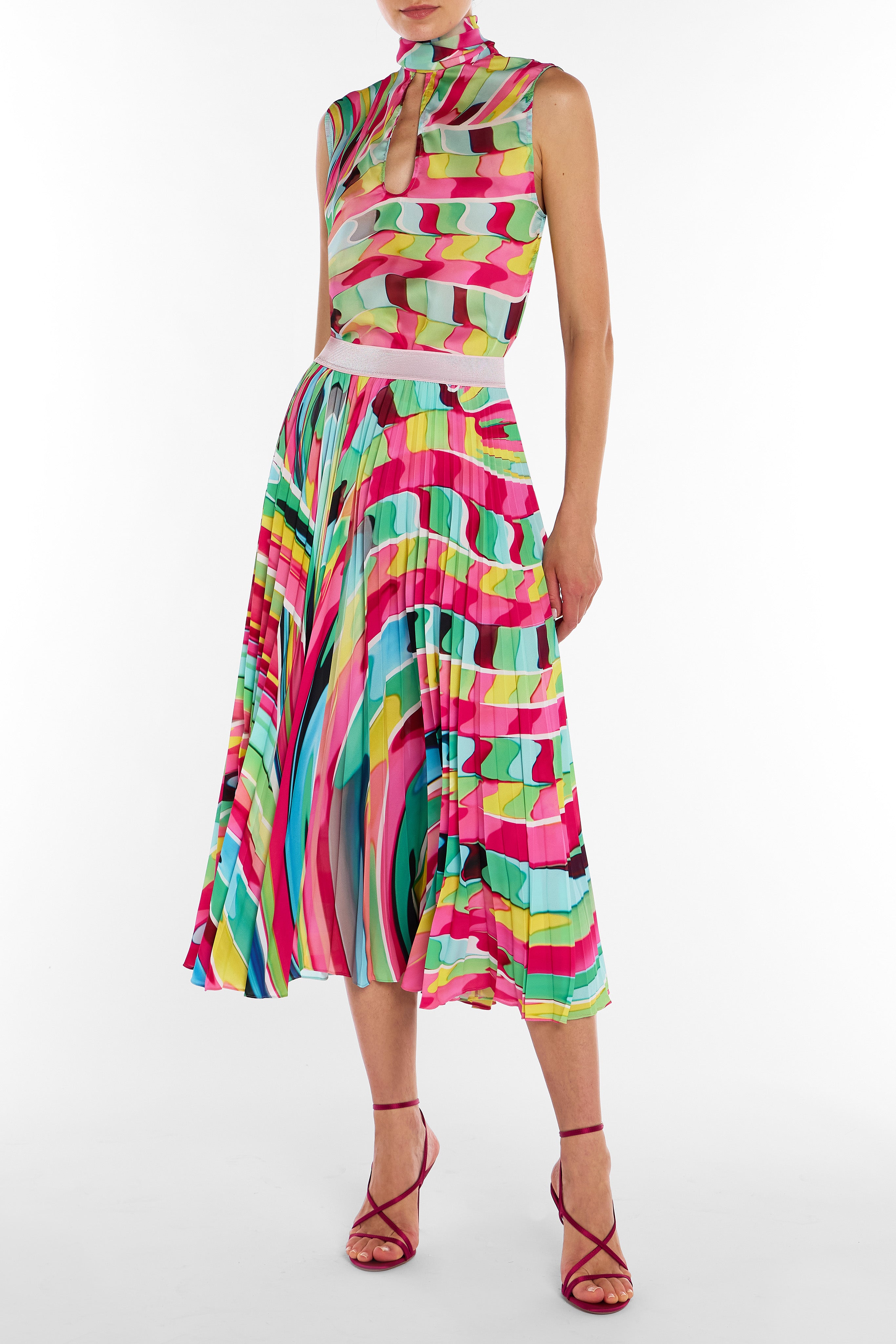 The Uni Skirt in Reticello Rainbow is a classic Mary Katrantzou staple, combining timeless elegance with modern sophistication. This midi-length pleated skirt is meticulously crafted, offering a flattering silhouette that exudes glamour and refinement. Designed to make a bold statement, the Uni Skirt ensures you turn heads and command attention at every occasion, whether dressed up for a formal event or styled for a chic everyday look.